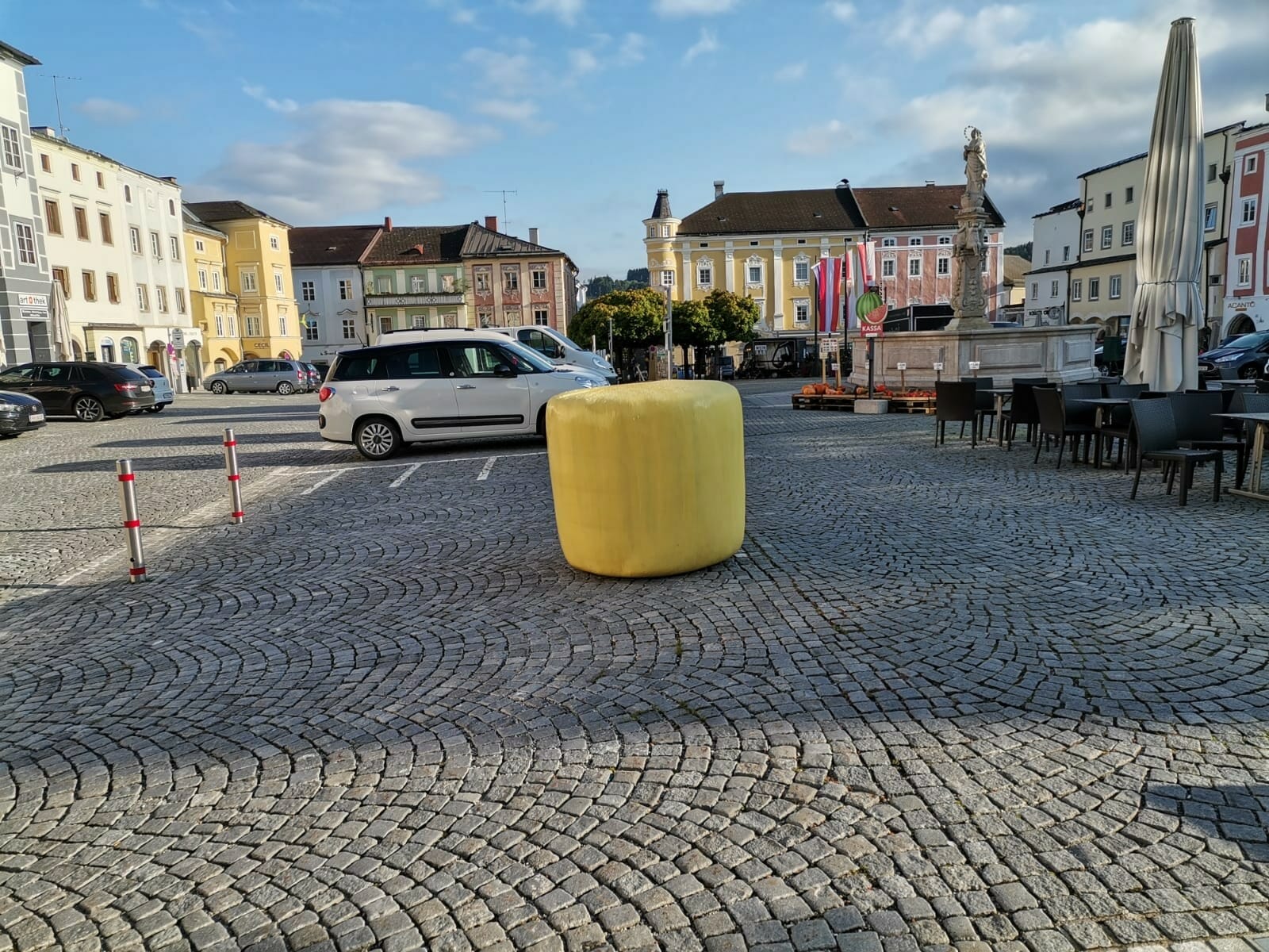 Seit mehreren Tagen prägen ca. ein Dutzend gelb folierte Heuballen das Freistädter Stadtbild, egal ob auf öffentlichen Plätzen, in Kreuzungsbereichen oder bei Kreisverkehren – kaum ein Eck der Stadt bleibt verschont von der aggressiv um sich greifenden gelben Welle.